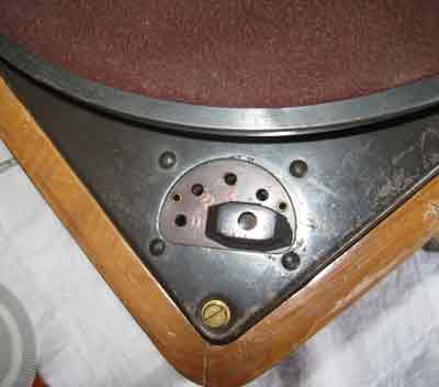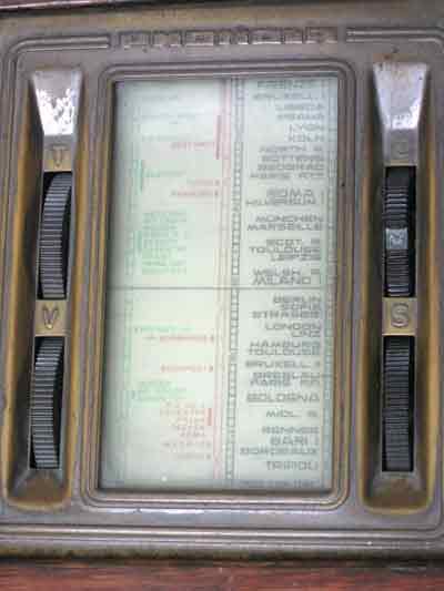 L'indice "circondato" dai vari comandi (da sinistra in senso orario: Volume, Tono, Gamme, Sintonia). La precisione della sintonia era assicurata dal movimento contemporaneo ed opposto dell'indice e della sottostante striscia con le scritte delle stazioni. |